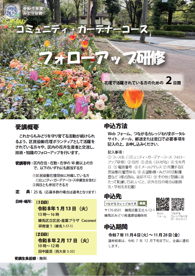 区内在住・在勤・在学の18歳以上の方で、以下のいずれにも該当する方。 1.区民協働花壇管理団体に所属している方 (コミュニティ・ガーデナーコース卒業生を含む) 2.両日とも参加できる方