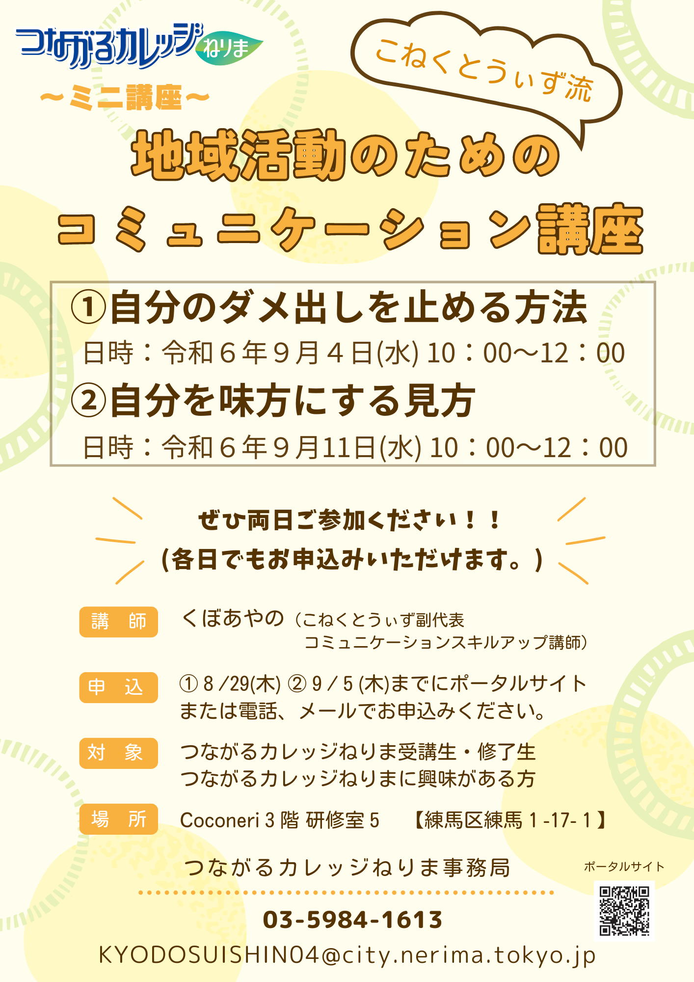 つながるカレッジねりまでは、ミニ講座や交流会を実施しています。受講生や修了生との交流を通じ、普段の講座では聞けない情報を知ることができる機会です。ぜひご参加ください!! 【こねくとうぃず流 地域活動のためのコミュニケーション講座】 〇内容:ゆっくり、じっくり自分の言葉を聞き、自分について考える、大人のコミュニケーションスキルアップ講座です。ワークやシェアを通して交流しながら、自分自身について考えてみませんか? ○日時:①自分のダメ出しを止める方法 9月4日(水)10:00~12:00 ②自分を味方にする見方 9月11日(水)10:00~12:00 ~両日の参加をおすすめします!!~ (各日でも参加できます) ○講師:くぼあやの(こねくとうぃず副代表兼コミュニケーションスキルアップ講師) 〇対象:つながるカレッジねりま受講生・修了生 つながるカレッジねりまに興味がある方 〇申込方法:ポータルサイト※、電話、メール ※参加希望日を「志望動機」欄に入力してください