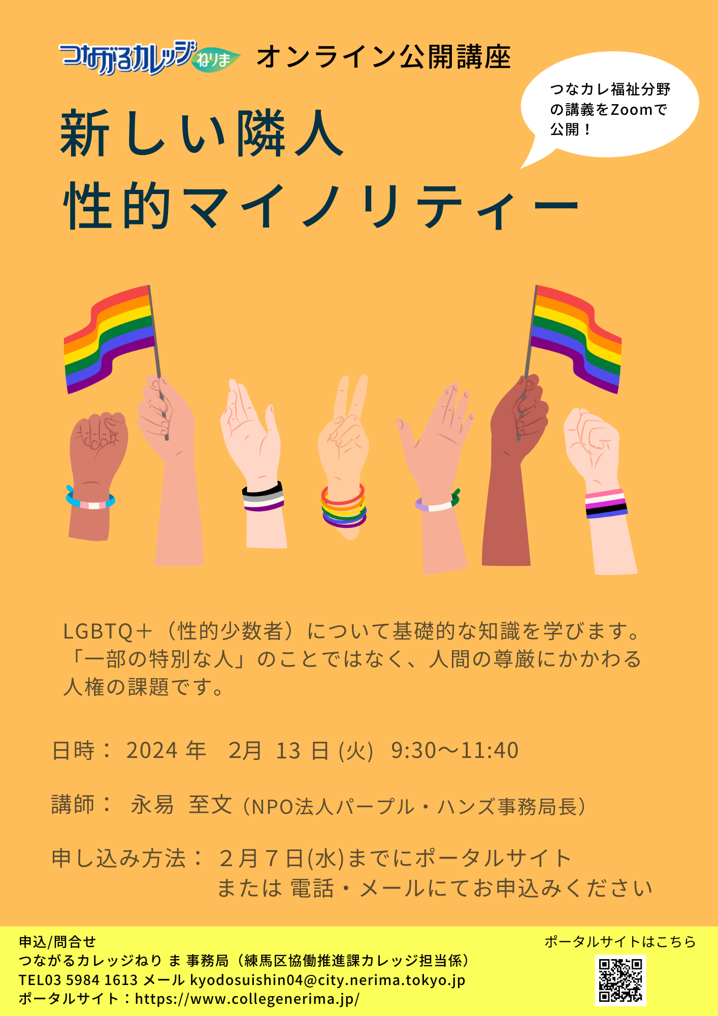 つながるカレッジねりま福祉分野の講座をオンラインで公開します。 「新しい隣人・性的マイノリティー」 LGBTQ+(性的少数者)について基礎的な知識を学びます。「一部の特別な人」のことではなく、人間の尊厳にかかわる人権の課題です。 ○日時:令和6年2月13日(火)午前9時30分から11時40分 ○講師:永易 至文(NPO法人パープル・ハンズ事務局長) ○受講方法:Zoomで配信します ○受講申込方法:ポータルサイトから申込みください。電話やメールでも受け付けています。 電話:03-5984-1613 メール:kyodosuishin04@city.nerima.tokyo.jp ※サイトから申込む場合は、ログインが必要です。 ○申込みをされた方には、後日ご登録されたメールアドレスに配信用URLをお送りいたします。